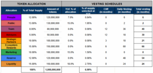 - % of Supply Unlocked at TGE: This indicates the percentage of tokens from each allocation that will be unlocked and available for use immediately after the TGE.
